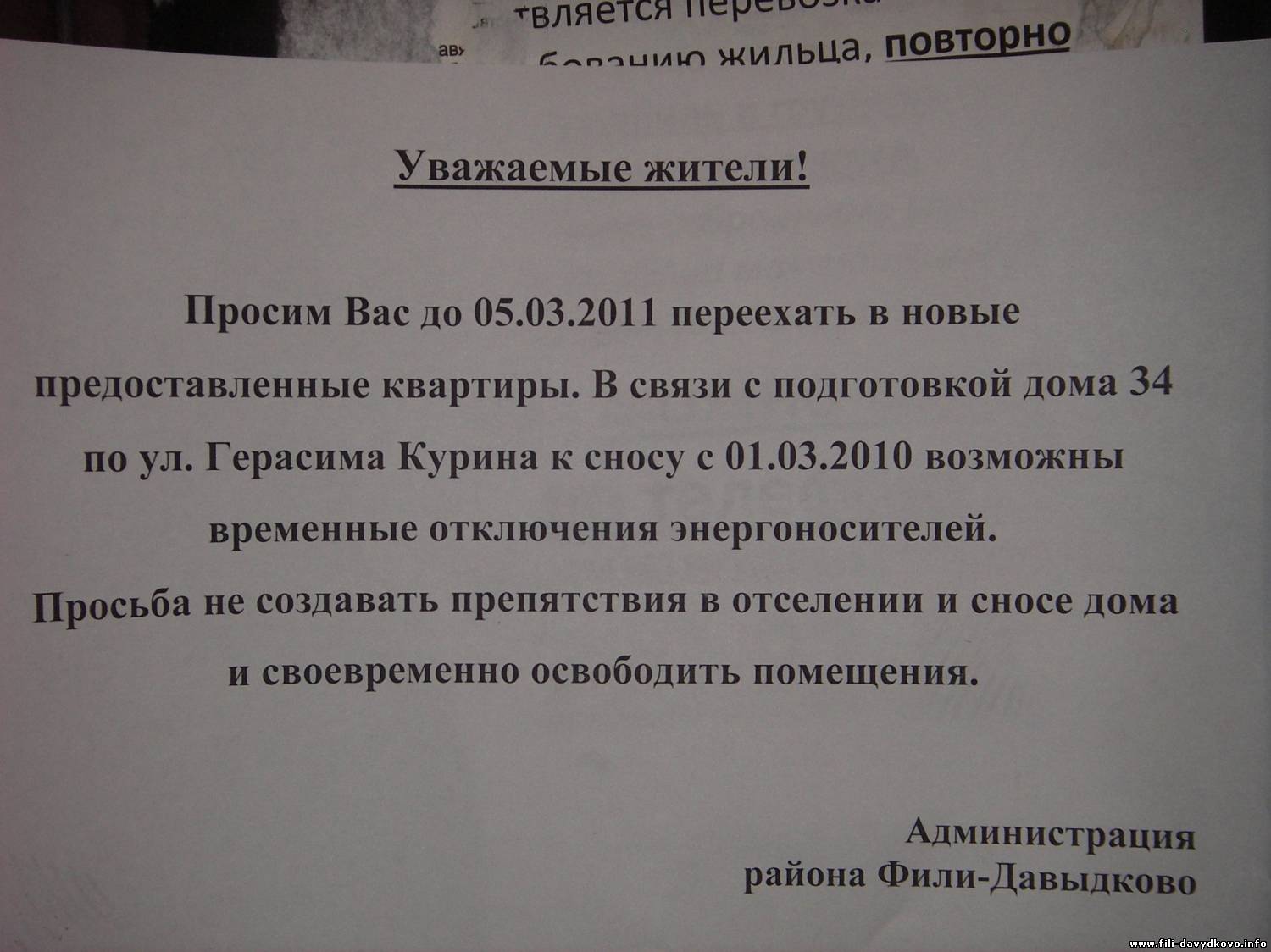 | Quote (НННН) А я свою все-таки отодрала. Тут мастер был, страху нагнал, я ему поверила, как отцу родному. Но плитку на стену больше не хочу, стеновую панель все-таки (наверное). Тоже морока - под нее стену выравнивать придется. Это что же он наговорил такого? Наташ, у вас все-таки не настолько кривые стены, надеюсь. А у нас - ох, чтобы угол 90 градусов получился - хорошо потрудиться надо))) А как иначе - кухня же не встанет(((( Зато потом что хошь можно будет на стенки класть - хошь плитку, хошь -панель)))) No, мне в общем-то все-равно, но только в той части дома 43-3, что ближе к 73 школе 2 "неразделанных" балкона... И тишина....Надеюсь, предпраздничная))))) Quote (Surok) Ирочка, мне думается с выселением под женский праздник - это пугалка для галочки. Оль, а еще вопрос - что это за автор такой - АДМИНИСТРАЦИЯ РАЙОНА ФИЛИ-ДАВЫДКОВА? Управа - понятно, а тут..."инкогнито из Петербурга" какой-то Вот фото сегодняшнего объвления