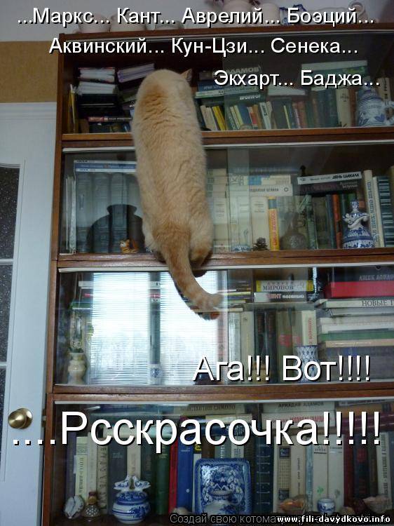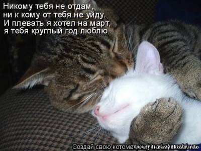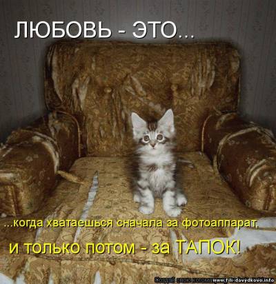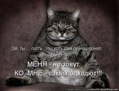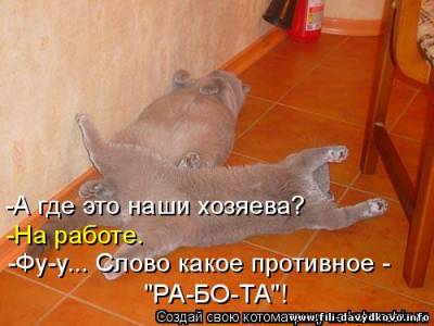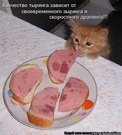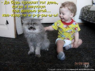 | Quote (Falc) В твоем же прикреплении Мухи - налево, а котлеты направо! Представь себе, я это видела Но мне показалось, что так лучше звучит - "Мухи - направо, котлеты - налево" За кошачьи фотки - большое спасибо, над некоторыми прямо хохотала  Добавлено (25.03.2011, 15:50) ---------------------------------------------
