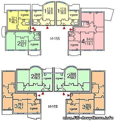 | Quote (Злюка) А что это за два "лаза" в кухню? В многосекц. И-155 они так делают (вроде, не во всех типах квартир), но я была и мне жутко понравилось(в 4-комнатной). Это чтобы не обходить через коридор. Quote (Злюка) Она еще упоминала что-то про второй туалет... Вот они, двушки с 2-мя туалетами. Либо такая, либо другая