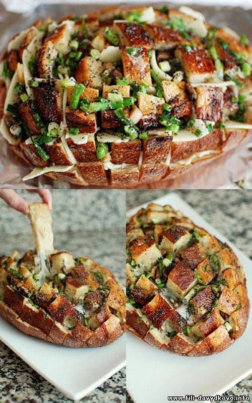 Ингредиенты: Сыр (проволоне) - 340 г Сливочное масло - 110 г Зеленый лук - 100 г Мак - 2 чайных ложки Буханка свежего хлеба Начинка: Шампиньоны - 340 г Сливочное масло - 1 столовая ложка Свежий тимьян (нарубленный) - 1 столовая ложка