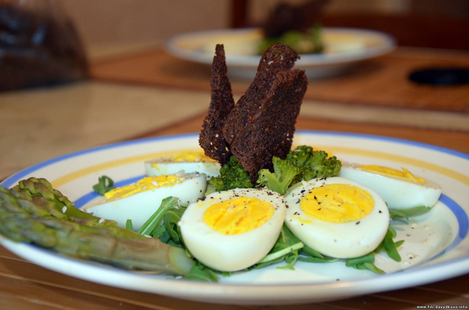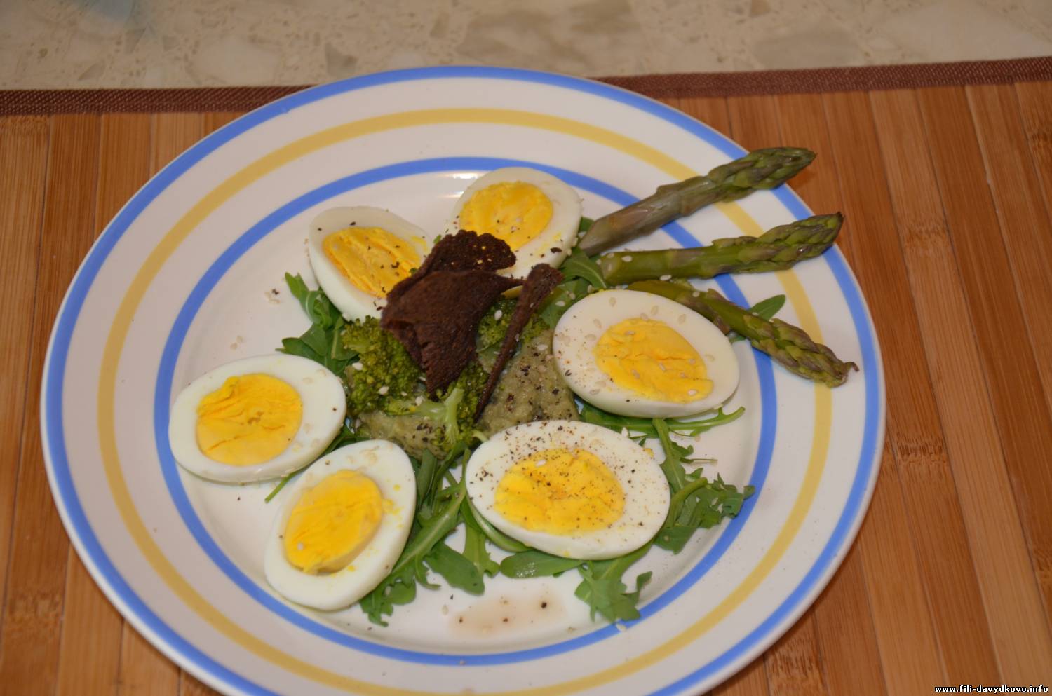 | вид сверху. руккола, 3 яйца ( меленькие они) ,спаржа , пюре (из брокколи, спаржи, шампиньонов и сливок) , крутоны из ржаного хлеба. соль, перец по вкусу.