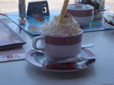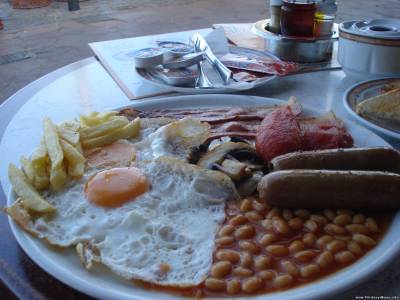 | A traditional English breakfast, как известно, is a big meal. Провела часть этого лета с англичанами, подтверждаю Здесь: сосиски, бекон, картошка, фасоль, грибы, маринованный помидор, два яйца, тосты с маслом и джемом. Ну, а поскольку у всех глобализация, смело меняем "облачный чай" (cloudy tea) на кофе со сливками. И полдня можно не есть!