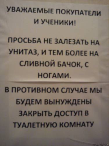 Если я еще могу понять аналогичное объявление на катке, в котором просят не залезать на унитаз в коньках, то вот целесообразности залезания НА БАЧОК понять так и не смогла...Это ж какую манию величия нужно иметь!!!!
