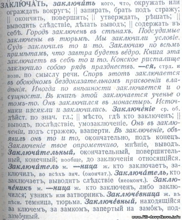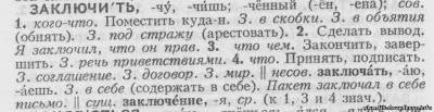 Quote (lewdmit) это еще актуально - могу прислать толкование с координатами. Если Вас не затруднит Но это не так срочно, время есть.  Добавлено (10.12.2012, 23:58) --------------------------------------------- lewdmit, вот например: ЗАКЛЮЧАТЬ ЗАКЛЮЧАТЬ, заключить кого, что, || окружать или ограждать вокруг; || запирать, брать под стражу; || окончить, повершить; || утверждать, решать; || выводить следствие, делать вывод; || содержать в себе.